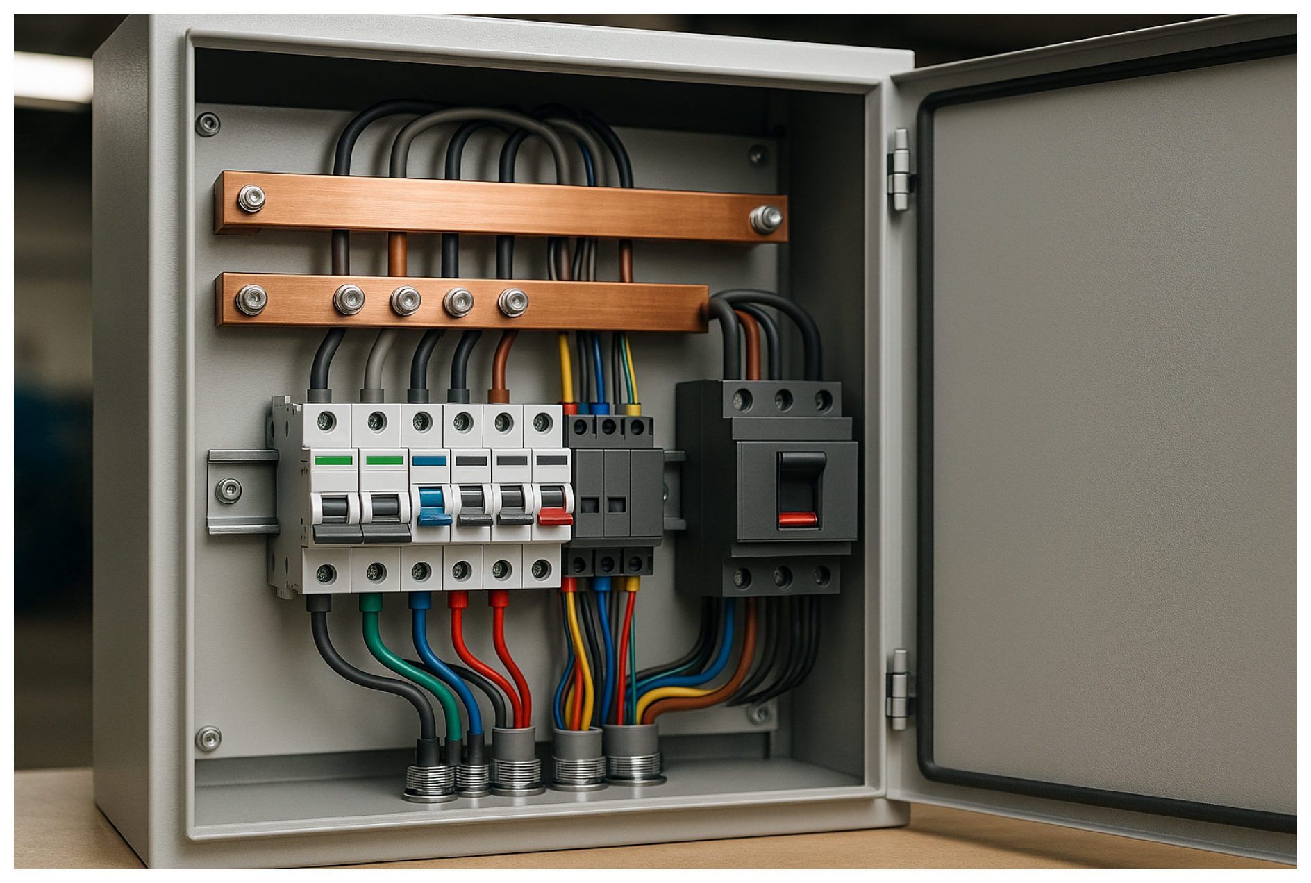 Enclosures: Metal cabinets (sheet steel, stainless steel options), powder-coated finishes, IP protection (e.g. IP54, IP65), DIN rail mounting.